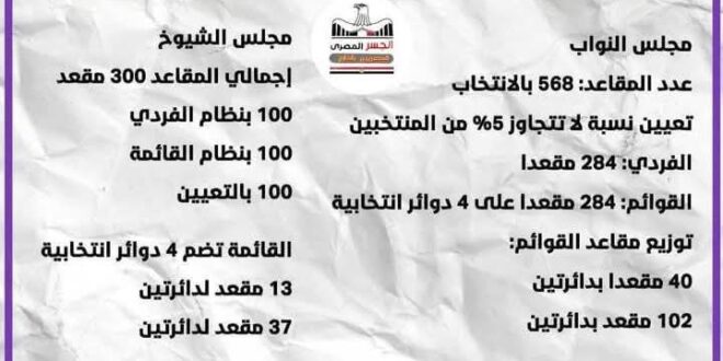مادة (٤ / فقرة أولى) : تقسم جمهورية مصر العربية إلى عدد من الدوائر تخصص للانتخاب بالنظام الفردي ، وعدد (٤) دوائر تخصص للانتخاب بنظام القائمة ، يُخصص لدائرتين منها عدد (٤٠) مقعدًا لكل دائرة منهما ، ويخصص للدائرتين الأخريين عدد (۱۰۲) من المقاعد لكل دائرة منهما ، ويحدد قانون خاص نطاق ومكونات كل دائرة انتخابية وعدد المقاعد المخصصة لها ، ولكل محافظة .
