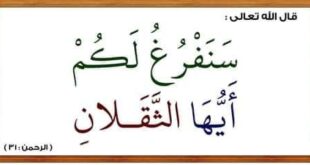 في رحاب سورة الرحمن   متابعة منال خليفة بسم الله الرحمن الرحيم ” سَنَفْرُغُ لَكُمْ أَيُّهَ الثَّقَلَانِ ” * الوسيط لطنطاوي : – ثم هدد- سبحانه- الذين يخالفون عن أمره تحذيرا شديدا، فقال: سَنَفْرُغُ لَكُمْ أَيُّهَ الثَّقَلانِ. فَبِأَيِّ آلاءِ رَبِّكُما تُكَذِّبانِ. – والثقلان: تثنية ثقل -، وأصله كل شيء له …