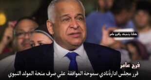 خالد عبد اللطيف قرر مجلس ادارة نادي سموحة برئاسة المهندس محمد فرج عامر الاحتفال بذكري المولد النبي الشريف بصرف مبلغ 500 جنيه لجميع العاملين منحة بتلك المناسبة العاطرة .. وذلك ايمانا من المجلس بالمشاركة الاجتماعية لرفع كاهل المعاناة عن العاملين واحتفالا بذكري مولد سيدنا محمد صل الله عليه وسلم .